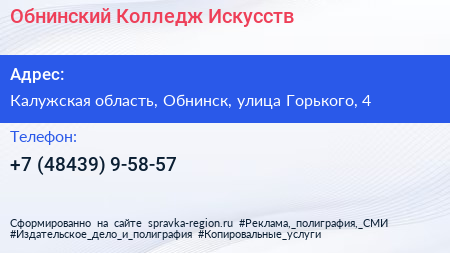 Обнинский Колледж Искусств по адресу Калужская область, Обнинск, улица Горького, 4 в дальнейшем Организация, размещена в следующих категориях: