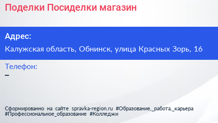 Поделки Посиделки, магазин по адресу Калужская область, Обнинск, улица Красных Зорь, 16 в дальнейшем Организация, размещена в следующих категориях: