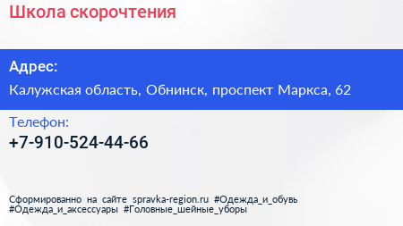 Школа скорочтения по адресу Калужская область, Обнинск, проспект Маркса, 62 в дальнейшем Организация, размещена в следующих категориях: