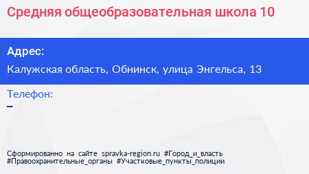 Средняя общеобразовательная школа №10 по адресу Калужская область, Обнинск, улица Энгельса, 13 в дальнейшем Организация, размещена в следующих категориях: