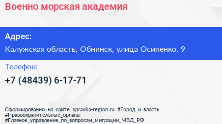 Военно-морская академия по адресу Калужская область, Обнинск, улица Осипенко, 9 в дальнейшем Организация, размещена в следующих категориях: