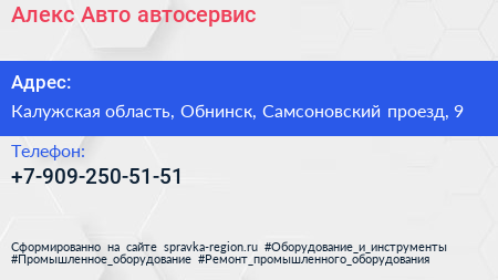 Алекс-Авто, автосервис по адресу Калужская область, Обнинск, Самсоновский проезд, 9 в дальнейшем Организация, размещена в следующих категориях: