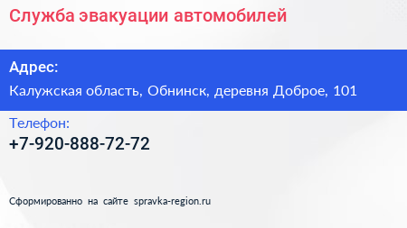 Служба эвакуации автомобилей по адресу Калужская область, Обнинск, деревня Доброе, 101 в дальнейшем Организация, размещена в следующих категориях: