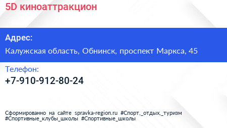5D, киноаттракцион по адресу Калужская область, Обнинск, проспект Маркса, 45 в дальнейшем Организация, размещена в следующих категориях: