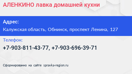 АЛЕНКИНО, лавка домашней кухни по адресу Калужская область, Обнинск, проспект Ленина, 127 в дальнейшем Организация, размещена в следующих категориях: