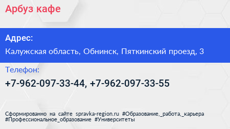 Арбуз, кафе по адресу Калужская область, Обнинск, Пяткинский проезд, 3 в дальнейшем Организация, размещена в следующих категориях: