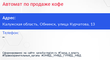 Автомат по продаже кофе по адресу Калужская область, Обнинск, улица Курчатова, 13 в дальнейшем Организация, размещена в следующих категориях: