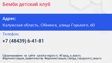 Бемби, детский клуб по адресу Калужская область, Обнинск, улица Горького, 60 в дальнейшем Организация, размещена в следующих категориях: