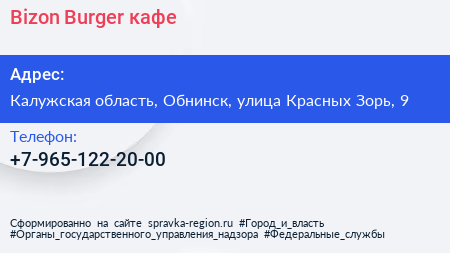 Bizon Burger, кафе по адресу Калужская область, Обнинск, улица Красных Зорь, 9 в дальнейшем Организация, размещена в следующих категориях: