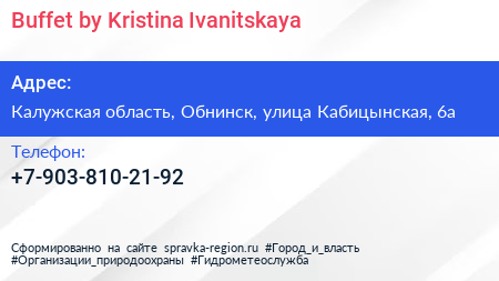 Buffet by Kristina Ivanitskaya по адресу Калужская область, Обнинск, улица Кабицынская, 6а в дальнейшем Организация, размещена в следующих категориях: