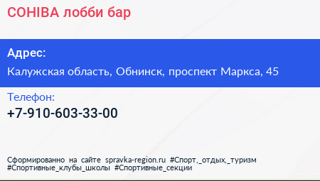 COHIBA, лобби-бар по адресу Калужская область, Обнинск, проспект Маркса, 45 в дальнейшем Организация, размещена в следующих категориях: