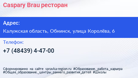 Caspary Brau, ресторан по адресу Калужская область, Обнинск, улица Королёва, 6 в дальнейшем Организация, размещена в следующих категориях: