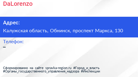 DaLorenzo по адресу Калужская область, Обнинск, проспект Маркса, 130 в дальнейшем Организация, размещена в следующих категориях: