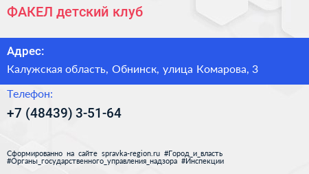 ФАКЕЛ, детский клуб по адресу Калужская область, Обнинск, улица Комарова, 3 в дальнейшем Организация, размещена в следующих категориях:
