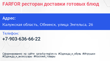 FARFOR, ресторан доставки готовых блюд по адресу Калужская область, Обнинск, улица Энгельса, 26 в дальнейшем Организация, размещена в следующих категориях: