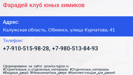 Фарадей, клуб юных химиков по адресу Калужская область, Обнинск, улица Курчатова, 41 в дальнейшем Организация, размещена в следующих категориях: