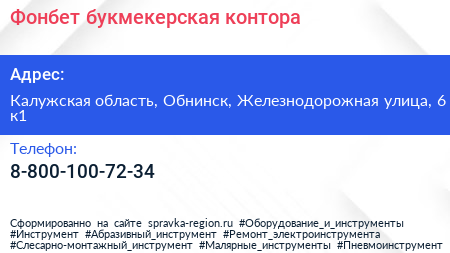 Фонбет, букмекерская контора по адресу Калужская область, Обнинск, Железнодорожная улица, 6 к1 в дальнейшем Организация, размещена в следующих категориях: