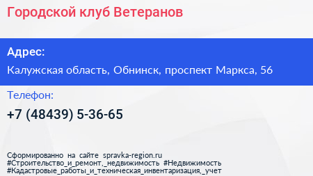 Городской клуб Ветеранов по адресу Калужская область, Обнинск, проспект Маркса, 56 в дальнейшем Организация, размещена в следующих категориях: