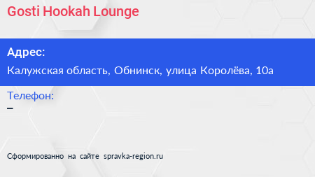 Gosti Hookah Lounge по адресу Калужская область, Обнинск, улица Королёва, 10а в дальнейшем Организация, размещена в следующих категориях: