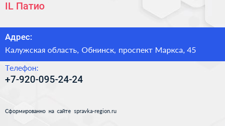 IL Патио по адресу Калужская область, Обнинск, проспект Маркса, 45 в дальнейшем Организация, размещена в следующих категориях: