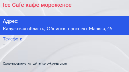 Ice Cafe, кафе-мороженое по адресу Калужская область, Обнинск, проспект Маркса, 45 в дальнейшем Организация, размещена в следующих категориях: