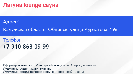 Лагуна-lounge, сауна по адресу Калужская область, Обнинск, улица Курчатова, 19в в дальнейшем Организация, размещена в следующих категориях: