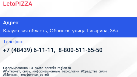 LetoPIZZA по адресу Калужская область, Обнинск, улица Гагарина, 36а в дальнейшем Организация, размещена в следующих категориях: