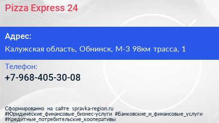Pizza Express 24 по адресу Калужская область, Обнинск, М-3 98км трасса, 1 в дальнейшем Организация, размещена в следующих категориях: