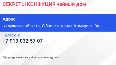 СЕКРЕТЫ КОНФУЦИЯ, чайный дом по адресу Калужская область, Обнинск, улица Комарова, 3а в дальнейшем Организация, размещена в следующих категориях:
