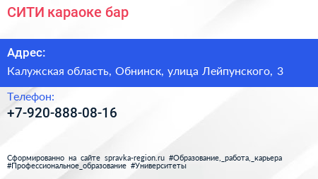 СИТИ, караоке-бар по адресу Калужская область, Обнинск, улица Лейпунского, 3 в дальнейшем Организация, размещена в следующих категориях: