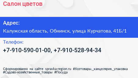 Салон цветов по адресу Калужская область, Обнинск, улица Курчатова, 41Б/1 в дальнейшем Организация, размещена в следующих категориях: