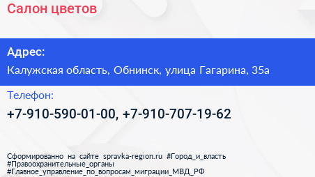 Салон цветов по адресу Калужская область, Обнинск, улица Гагарина, 35а в дальнейшем Организация, размещена в следующих категориях:
