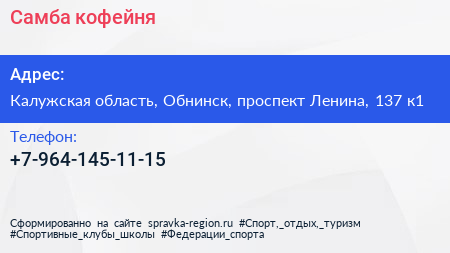 Самба, кофейня по адресу Калужская область, Обнинск, проспект Ленина, 137 к1 в дальнейшем Организация, размещена в следующих категориях: