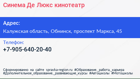 Синема Де Люкс, кинотеатр по адресу Калужская область, Обнинск, проспект Маркса, 45 в дальнейшем Организация, размещена в следующих категориях: