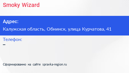 Smoky Wizard по адресу Калужская область, Обнинск, улица Курчатова, 41 в дальнейшем Организация, размещена в следующих категориях: