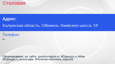 Столовая по адресу Калужская область, Обнинск, Киевское шоссе, 59 в дальнейшем Организация, размещена в следующих категориях: