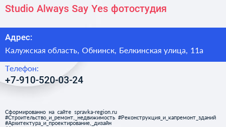 Studio Always Say Yes, фотостудия по адресу Калужская область, Обнинск, Белкинская улица, 11а в дальнейшем Организация, размещена в следующих категориях: