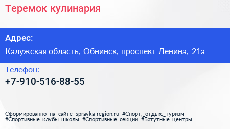 Теремок, кулинария по адресу Калужская область, Обнинск, проспект Ленина, 21а в дальнейшем Организация, размещена в следующих категориях: