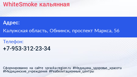 WhiteSmoke, кальянная по адресу Калужская область, Обнинск, проспект Маркса, 56 в дальнейшем Организация, размещена в следующих категориях: