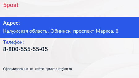 5post по адресу Калужская область, Обнинск, проспект Маркса, 8 в дальнейшем Организация, размещена в следующих категориях: