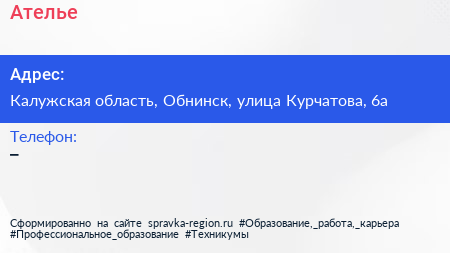 Ателье по адресу Калужская область, Обнинск, улица Курчатова, 6а в дальнейшем Организация, размещена в следующих категориях: