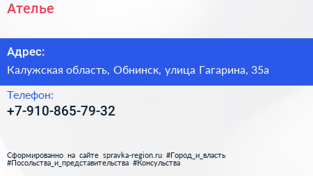 Ателье по адресу Калужская область, Обнинск, улица Гагарина, 35а в дальнейшем Организация, размещена в следующих категориях: