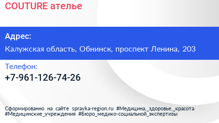 COUTURE, ателье по адресу Калужская область, Обнинск, проспект Ленина, 203 в дальнейшем Организация, размещена в следующих категориях: