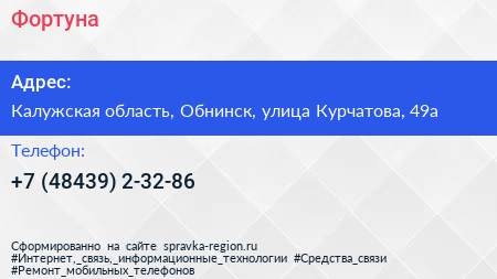 Фортуна по адресу Калужская область, Обнинск, улица Курчатова, 49а в дальнейшем Организация, размещена в следующих категориях: