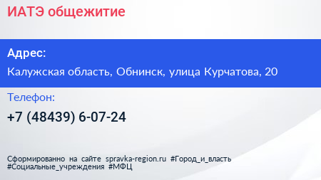 ИАТЭ, общежитие по адресу Калужская область, Обнинск, улица Курчатова, 20 в дальнейшем Организация, размещена в следующих категориях: