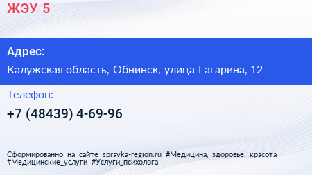 ЖЭУ №5 по адресу Калужская область, Обнинск, улица Гагарина, 12 в дальнейшем Организация, размещена в следующих категориях: