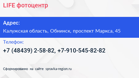 LIFE, фотоцентр по адресу Калужская область, Обнинск, проспект Маркса, 45 в дальнейшем Организация, размещена в следующих категориях: