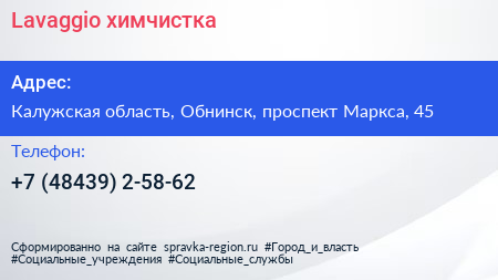 Lavaggio, химчистка по адресу Калужская область, Обнинск, проспект Маркса, 45 в дальнейшем Организация, размещена в следующих категориях: