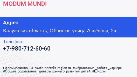 MODUM MUNDI по адресу Калужская область, Обнинск, улица Аксёнова, 2а в дальнейшем Организация, размещена в следующих категориях: