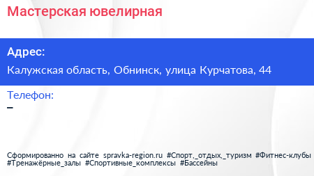 Мастерская ювелирная по адресу Калужская область, Обнинск, улица Курчатова, 44 в дальнейшем Организация, размещена в следующих категориях: